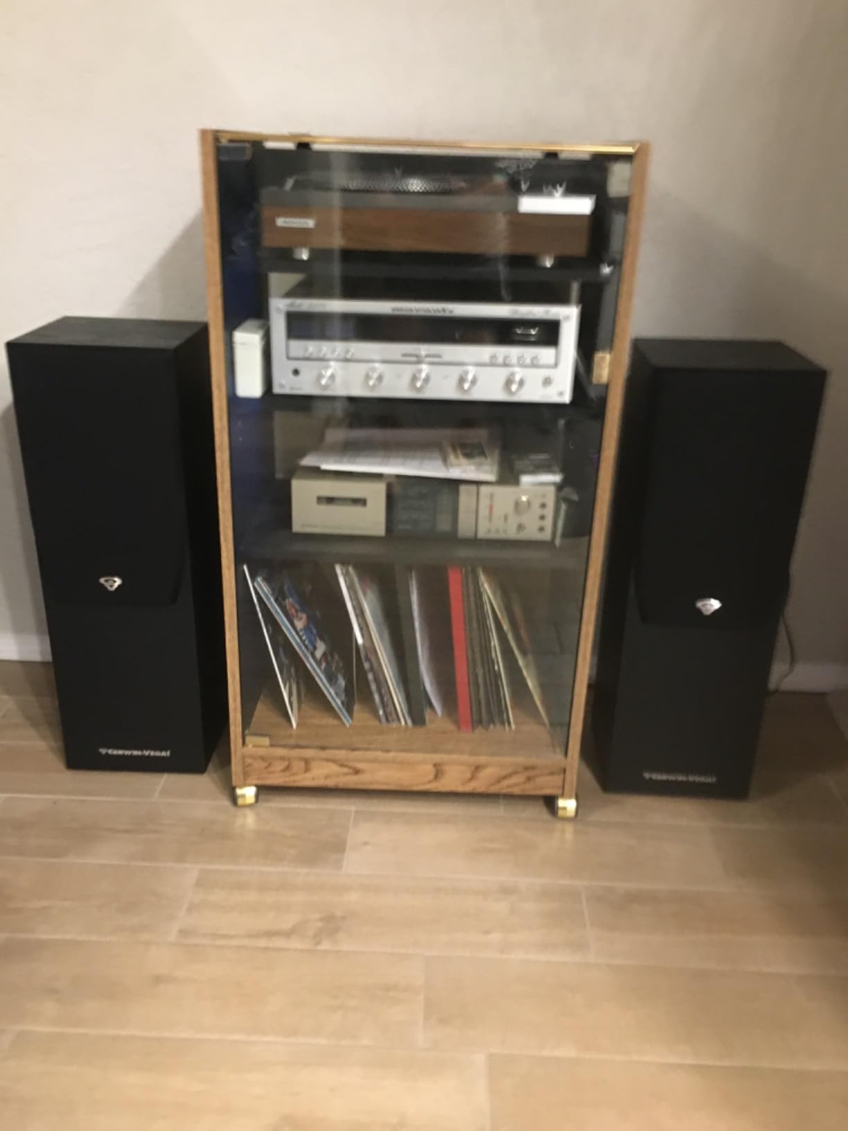 Home stereo system front speakers,coupled with a 10 inch powered subwoofer